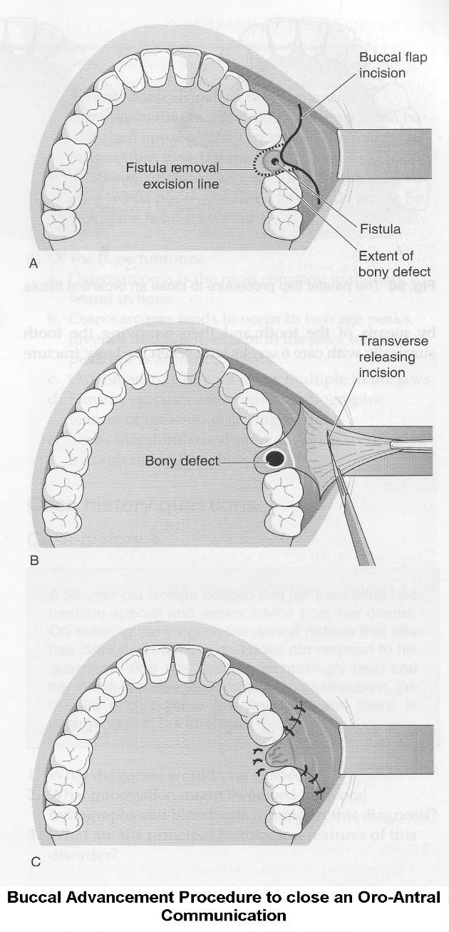 If the tissue used to close the mouth-sinus hole is drawn from the cheek, then the space between the cheek / lips and the teeth (sulcus) is lessened (temporarily). This tends to slacken off with time but may necessitate a further op to restore the sulcus.